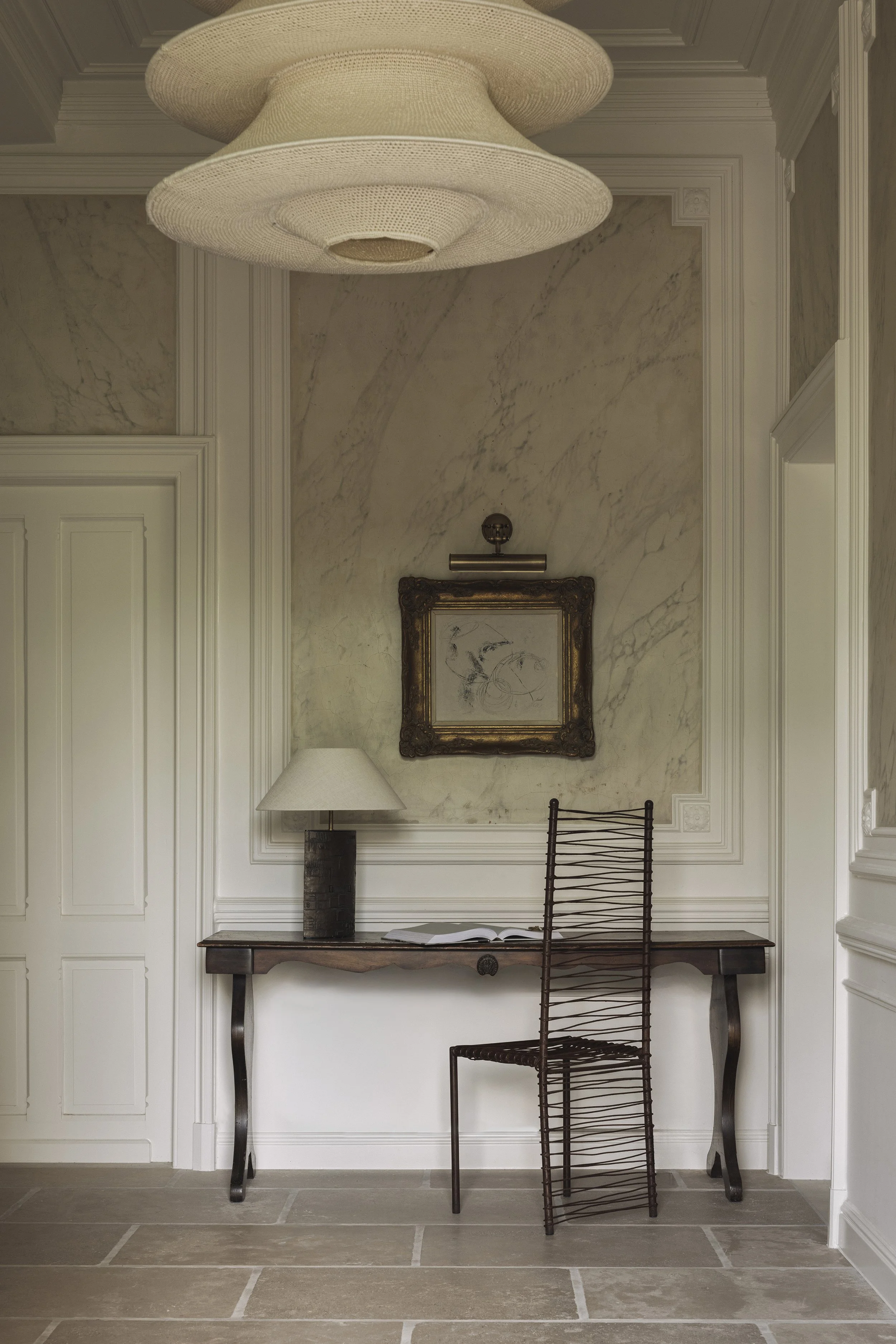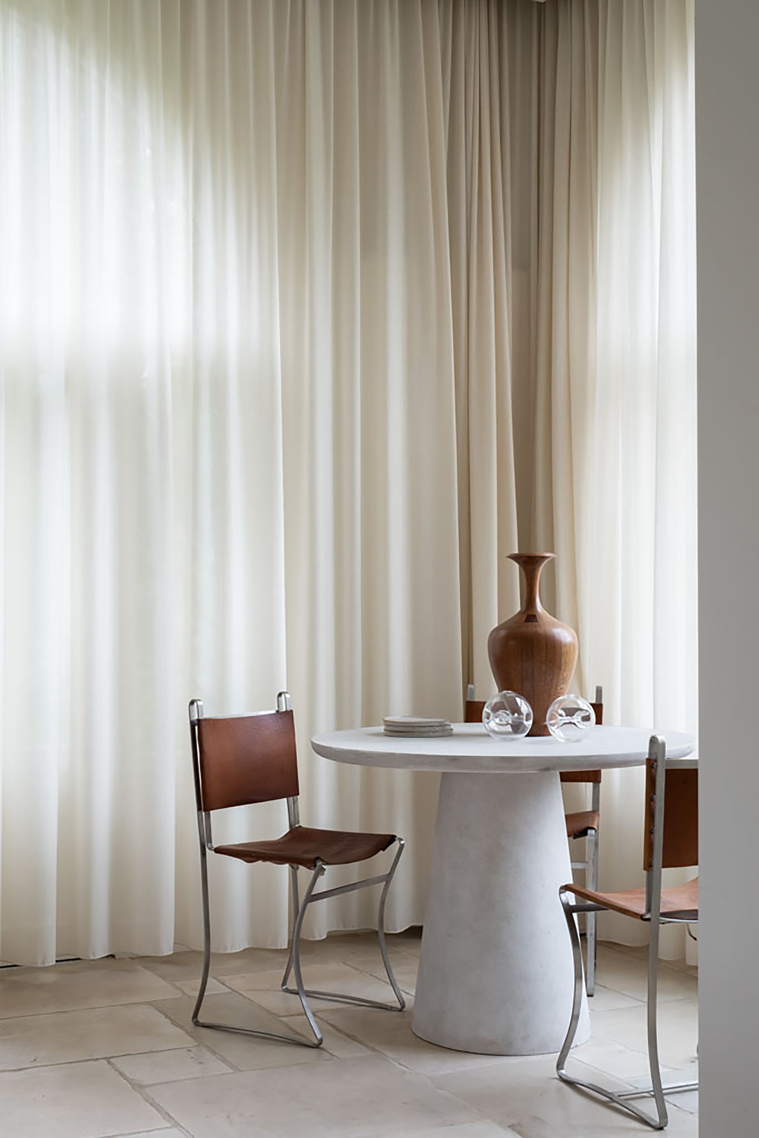 The home’s architectural details allow for the perfect neutral backdrop for productions, including high ceilings, flagstone flooring, large windows, sisal carpeting, and herringbone oak floors.